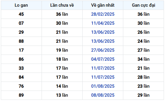 Tóm lại, dữ liệu cho thấy đa phần các cặp số đang ở giai đoạn giữa hoặc đầu chu kỳ gan, ngoại trừ 45–54 đang tiến gần mức cực đại lịch sử. Các cặp có khoảng cách giữa “lần chưa về” và “gan cực đại” lớn hơn thường biểu hiện tính ổn định cao hơn trong chu kỳ xuất hiện.