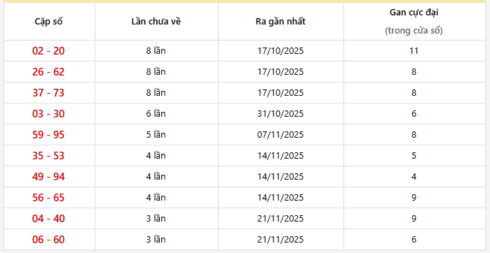 ⭐️ Cặp lô khan BD ít về nhất: 02 - 20 (8 lần), 26 - 62 (8 lần) , 37 - 73 (8 lần), 03 - 30 (6 lần), 59 - 95 (7 lần)