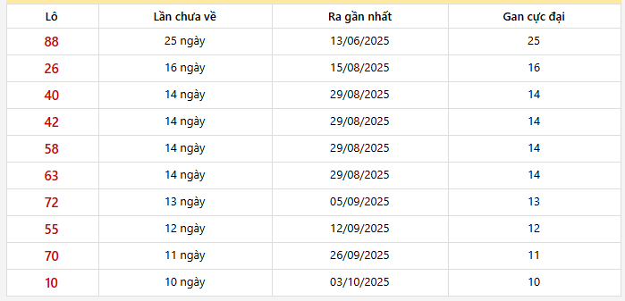 ⭐️ Những cặp số lô gan XSBD lâu xuất hiện nhất: Lô gan 88 lâu ra nhất (25 ngày)