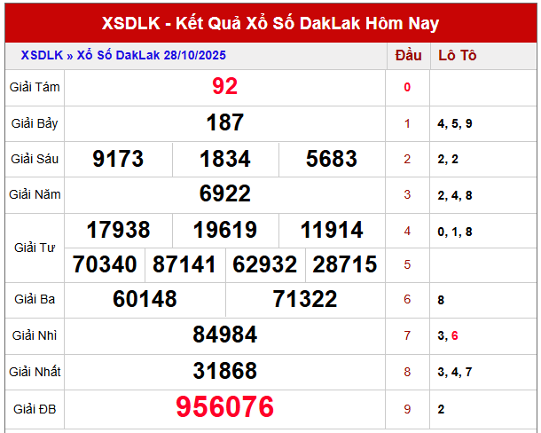 Hãy tham khảo ngay bảng quay thử Xổ số Đắk Lắk ngày 4/11/2025 được hệ thống tự động tạo lập bằng công nghệ tiên tiến. Nhờ ứng dụng các thuật toán hiện đại, các con số được lựa chọn ngẫu nhiên, đảm bảo tính minh bạch, khách quan và độ chính xác cao trong từng kết quả hiển thị.
