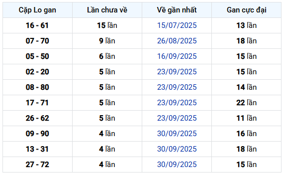 Nhìn chung, dữ liệu này giúp nhận biết rõ mức độ xuất hiện và chu kỳ của từng cặp số, từ đó hỗ trợ người quan tâm dễ dàng theo dõi biến động và xu hướng trong những kỳ quay sắp tới.