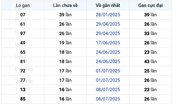 Tổng thể, dữ liệu trên phản ánh rõ quy luật tần suất xuất hiện của các con số trong thời gian gần đây, giúp người theo dõi dễ dàng nhận biết xu hướng và đưa ra nhận định hợp lý cho kỳ quay tiếp theo.