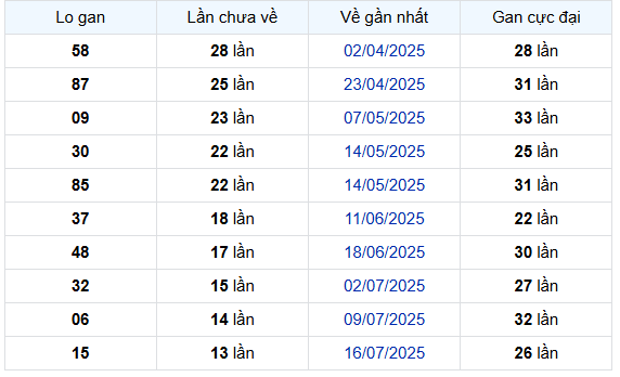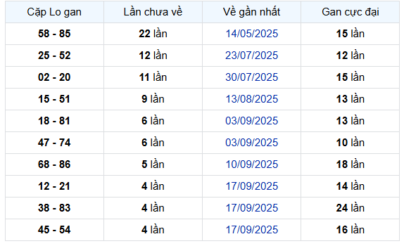 Tổng hợp lại, bảng dữ liệu cho thấy xu hướng gan đang giãn rộng ở một số cặp số, đặc biệt là nhóm đầu bảng như 58 – 85 và 25 – 52, trong khi nhóm dưới có thể sớm xuất hiện trở lại trong vài kỳ quay tiếp theo.