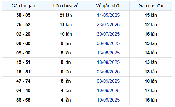 Dựa trên bảng dữ liệu, có thể nhận thấy một số cặp số đang ở trạng thái “gan dài”, tức là đã khá lâu chưa xuất hiện trở lại.