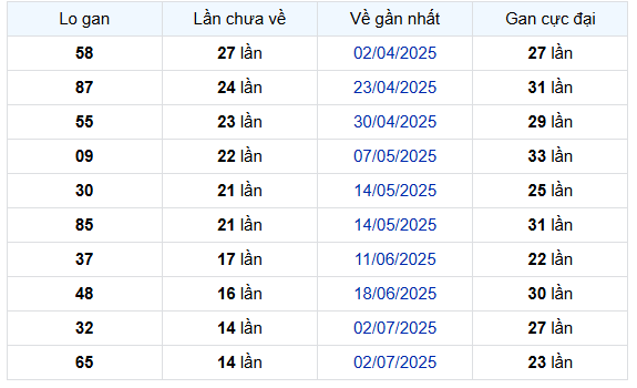 - Trước hết, con số 58 đang dẫn đầu danh sách khi đã 27 lần chưa xuất hiện kể từ ngày 02/04/2025, đồng thời đây cũng là mốc gan cực đại của nó. Điều này cho thấy tần suất xuất hiện của số 58 đang ở mức thấp nhất trong chu kỳ gần đây, cần được lưu ý trong các kỳ mở thưởng sắp tới.