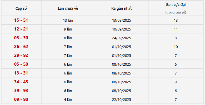 ⭐️ Cặp lô khan DN ít về nhất: 15 - 51 (13 lần), 12 - 21 (9 lần), 03 - 30 (8 lần), 26 - 62 (5 lần), 29 - 92 (7 lần)