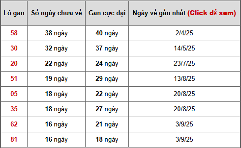 Lô 58 – 38 ngày → dẫn đầu bảng gan, chỉ còn cách gan cực đại 40 ngày đúng 2 ngày → xác suất hồi phục cao, ưu tiên theo dõi.
