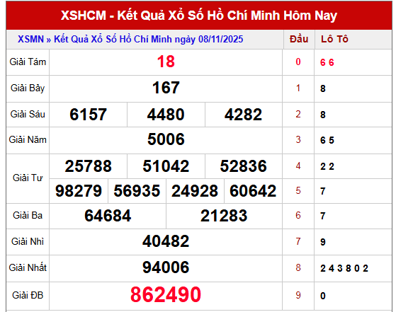 Tham khảo xổ số Hồ Chí Minh hôm nay cùng bảng thống kê chi tiết gồm giải 8, đầu – đuôi giải đặc biệt và dữ liệu XSHCM 30 ngày gần nhất. Thông tin được cập nhật thường xuyên giúp bạn dễ dàng nhận diện xu hướng và chọn con số có khả năng trúng cao.
