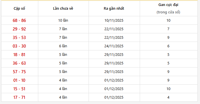 ⭐️ Cặp lô khan HCM ít về nhất: 68 - 86 (10 lần), 29 - 92 (7 lần) , 35 - 53 (7 lần), 03 - 30 (6 lần), 18 - 81 (5 lần)