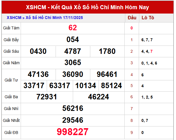 Dưới đây là bảng kết quả quay thử Hồ Chí Minh thứ 7 ngày 22/11/2025 do xosodaiviet.mobi thực hiện. Mời quý vị tham khảo và lựa chọn con số may mắn cho mình trong hôm nay!