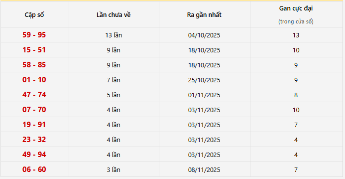 ⭐️ Cặp lô khan HCM ít về nhất: 59 - 95 (13 lần), 15 - 51 (9 lần), 58 - 85 (9 lần), 78 - 87 5 lần), 01 - 10 (7 lần)