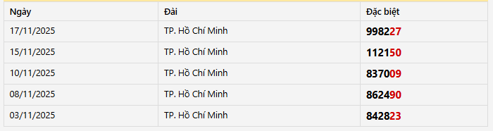 Thống kê giải đặc biệt tỉnh Hồ Chí Minh trong 5 kỳ quay gần nhất