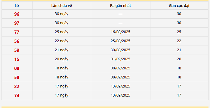 ⭐️ Những cặp số lô gan XSHCM lâu xuất hiện nhất: Lô gan 96 lâu ra nhất (30 ngày)