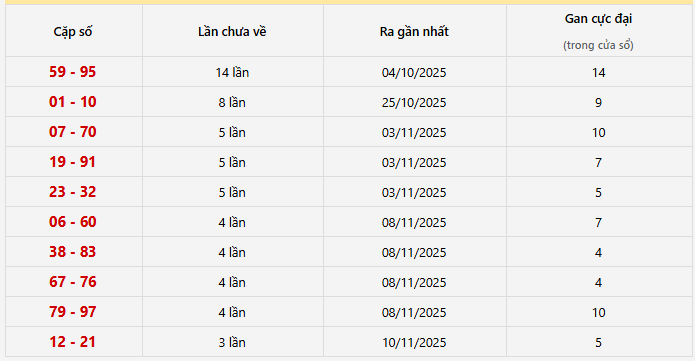 ⭐️ Cặp lô khan HCM ít về nhất: 59 - 95 (14 lần), 01 - 10 (8 lần), 07 - 70 (5 lần), 19 - 91 (5 lần), 23 - 32 (5 lần)