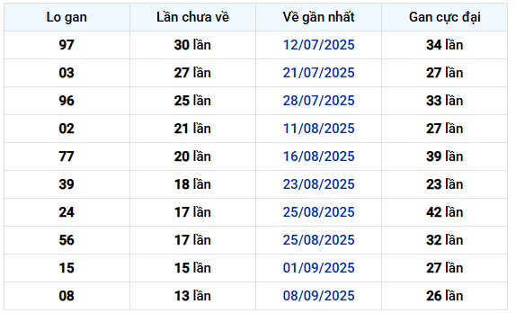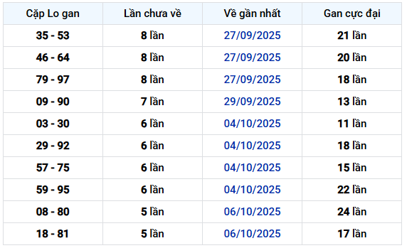 Tổng thể, dữ liệu cho thấy các cặp số đang ở giai đoạn giữa và cuối chu kỳ gan, đặc biệt nhóm từ 6 – 8 lần chưa về đang chiếm ưu thế. Việc theo dõi xu hướng của những cặp này trong các kỳ tiếp theo sẽ giúp nhận diện rõ hơn nhịp biến động và thời điểm quay trở lại của từng cặp.