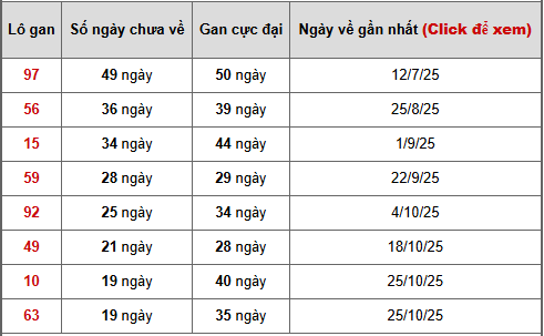 - Bảng thống kê lô gan Hồ Chí Minh lâu chưa ra tính đến ngày 3/1/2025
