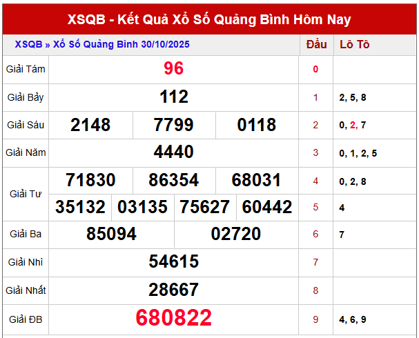 ⭐ Giải đặc biệt Quảng Bỉnh: 00 - 96
