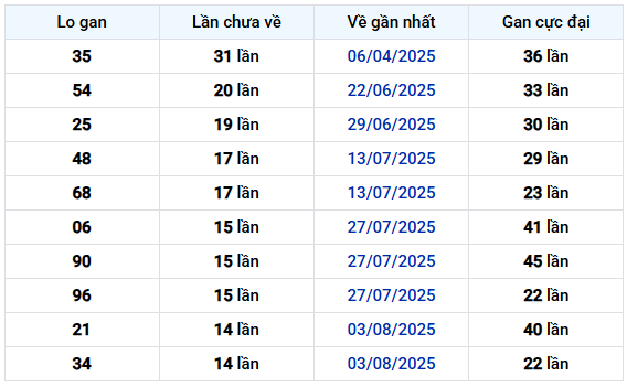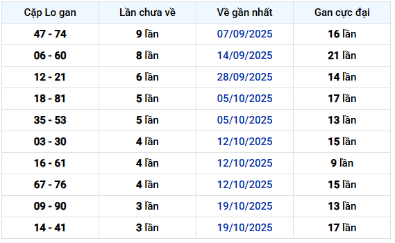 Bảng thống kê các cặp số cho thấy số lần xuất hiện gần đây, lần xuất hiện gần nhất và mức gan cực đại từng cặp.
