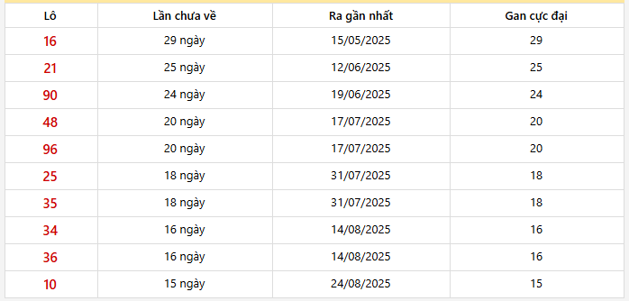 ⭐️ Những cặp số lô gan XSTG lâu xuất hiện nhất: Lô gan 16 lâu ra nhất (29 ngày)