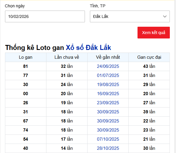- Bảng thống kê lô gan DAK LAK lâu chưa ra tính đến ngày 10/2/2025