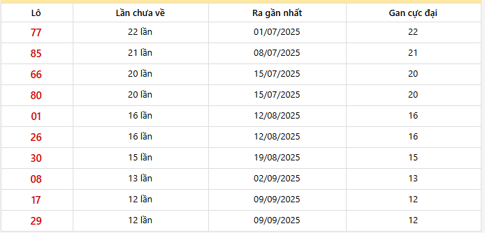 ⭐️ Cặp lô khan DLK ít về nhất: 08-80 (13 lần), 01-10 (9 lần), 03-30 (9 lần), 24-42 (8 lần), 45-54 (7 lần)