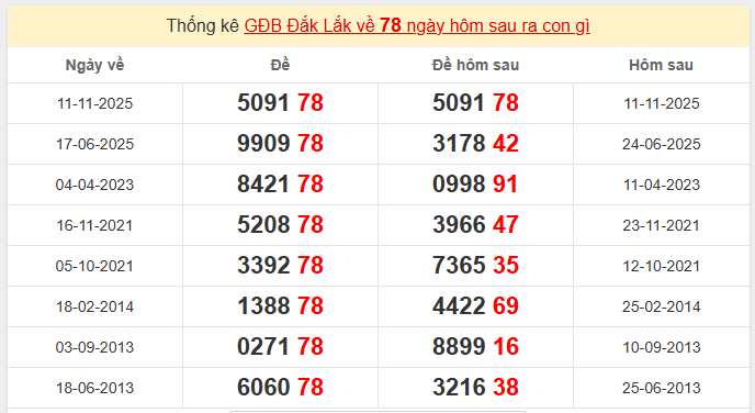 Thống kê GĐB DAKLAK về 78 ngày hôm sau ra con gì