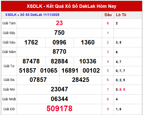 Để dự đoán xổ số DAKLAK ngày 18/11/2025 chính xác hơn, hãy xem lại kết quả các kỳ trước và đối chiếu cùng bảng thống kê, giúp bạn nhận biết những con số xuất hiện nhiều khả năng mang lại may mắn.