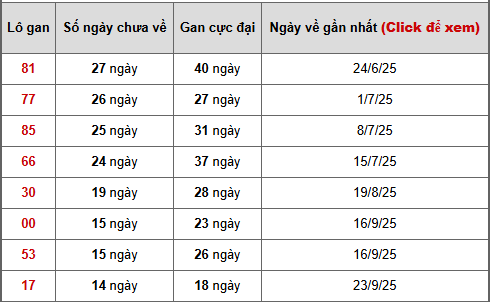 - Bảng thống kê lô gan DAKLAK lâu chưa ra tính đến ngày 6/1/2025