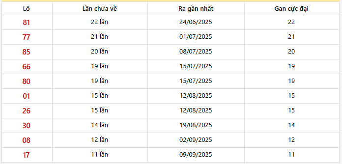 ⭐️ Cặp lô khan DLK ít về nhất: 59 - 95 (17 lần), 19 - 91 (8 lần), 12 - 21 (6 lần), 68 - 86 (6 lần), 02 - 20 (5 lần)