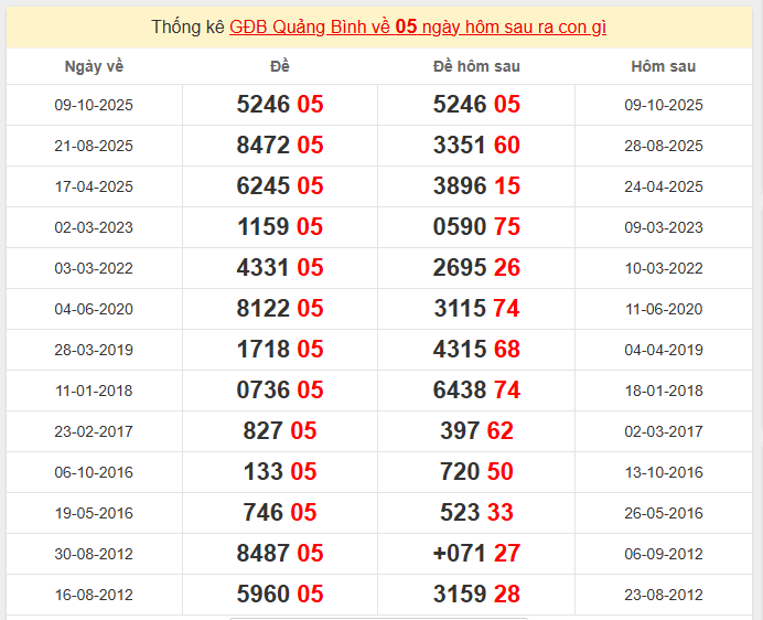 Thống kê GĐB Quảng Bình về 05 ngày hôm sau ra con gì