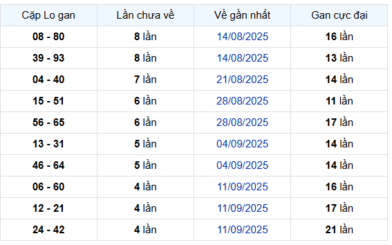 - Từ bảng thống kê có thể nhận thấy, các cặp số 08 – 80 và 39 – 93 hiện đang có chu kỳ 8 lần chưa xuất hiện, là những cặp có thời gian vắng mặt dài nhất tính đến nay. Trong đó, cặp 08 – 80 từng đạt gan cực đại 16 lần, cho thấy tần suất xuất hiện của cặp này thường cách quãng khá lớn.