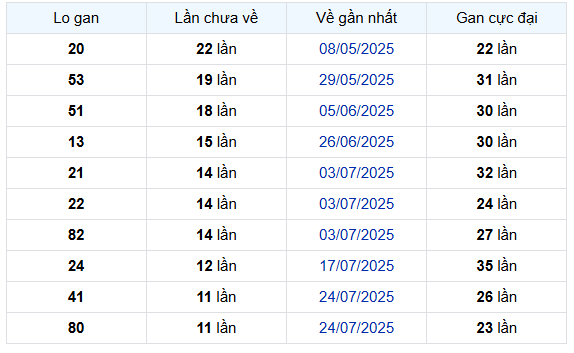 - Các số 53, 51 và 13 cũng đang ở mức độ gan cao, dao động từ 15 đến 19 lần chưa ra, trong khi các con số như 21, 22 và 82 duy trì chu kỳ ổn định, từng đạt gan cực đại trên 24–32 lần trong quá khứ.