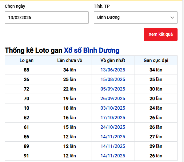 - Bảng thống kê lô gan Bình Dương lâu chưa ra tính đến ngày 13/2/2025