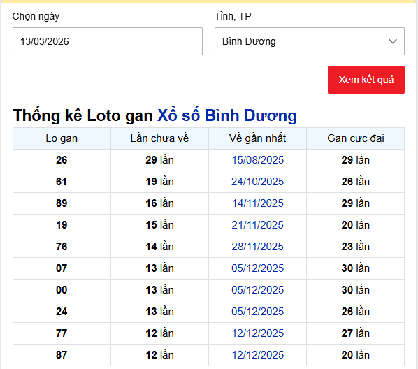 🔹Ở nhóm gan thấp hơn một chút là 77 và 87 với 12 lần chưa về, tuy chưa quá dài nhưng vẫn đủ để lọt vào danh sách lô cần theo dõi. Những dữ liệu này thường được nhiều người chơi tham khảo khi dự đoán xổ số Bình Dương ngày 13 tháng 3 năm 2026, bởi các lô gan lâu ngày thường có xu hướng được chú ý trong các kỳ quay tiếp theo.