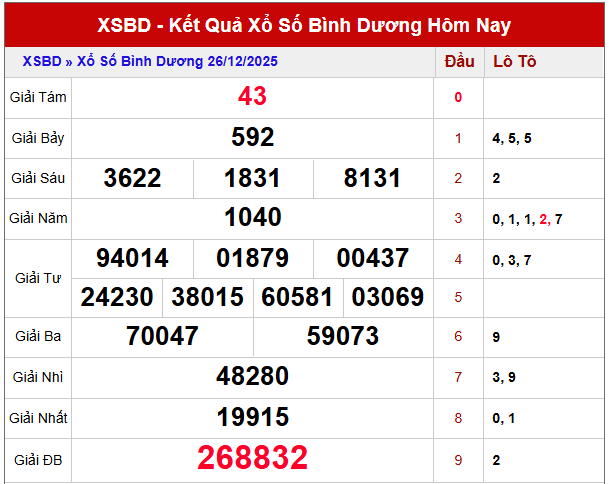 Tổng hợp dữ liệu XSBD 30 ngày quay gần nhất cho thấy những biến động đáng chú ý về tần suất xuất hiện của các con số. Từ nền tảng đó, phần dự đoán XS Bình Dương ngày 2/1/2026 dưới đây được chọn lọc kỹ, mang đến nguồn tham khảo đáng tin cậy để bạn cân nhắc.