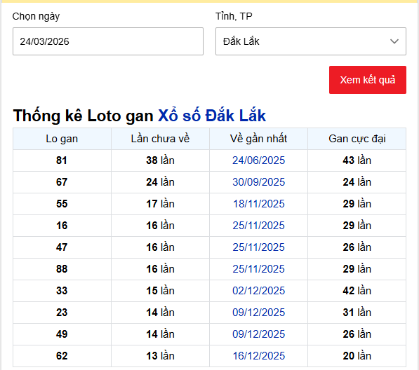 Dựa vào bảng thống kê Loto gan xổ số Đắk Lắk, có thể thấy nhiều con số đang rơi vào vùng gan sâu, trong đó có những lô đã tiến rất sát hoặc chạm đỉnh gan cũ – dạng dữ liệu thường thu hút mạnh khi phân tích soi cầu xổ số DAK LAK ngày 24 tháng 3 năm 2026.