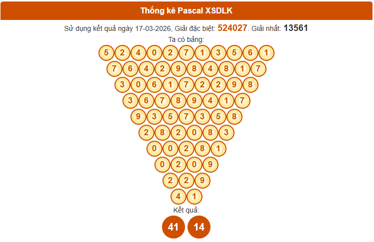Phương pháp Pascal là một trong những cách soi cầu được nhiều người áp dụng khi phân tích XS DAKLAK ngày 24/3/2026. Với cấu trúc logic đặc trưng của bảng Pascal, những cặp số tiềm năng có thể được nhận diện nhanh chóng từ dữ liệu kết quả gần đây.