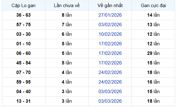 Theo bảng số liệu, các cặp lô đáng chú ý nhất hiện tại là 36 – 63, 57 – 75, 03 – 30 – đây là nhóm cặp số đang ở vùng gan trung bình đến gan cao. Người chơi thường kết hợp thêm dữ liệu chu kỳ khi dự đoán XSDLK ngày 31/3/2026 để lựa chọn cặp số theo thống kê gan.