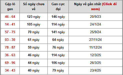 46 – 64 đang giữ vị trí gan sâu nhất bảng với 123 ngày chưa về, trong khi gan cực đại từng chạm 146 ngày. Khoảng cách này cho thấy cặp số vẫn còn dư địa nhưng đã bước vào vùng gan “hiếm”, thường được xem là tâm điểm của các bảng theo dõi dài hạn.