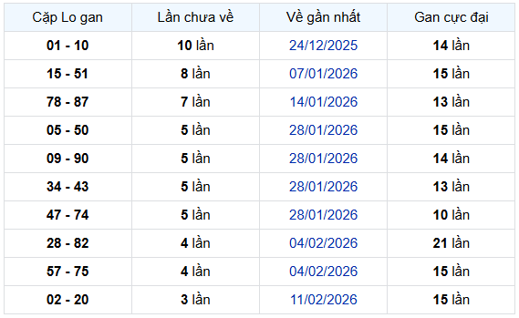 Dựa trên bảng thống kê cặp lô gan hiện tại, có thể thấy một vài cặp số đang bắt đầu bước vào giai đoạn tích lũy gan đáng chú ý, dễ trở thành tâm điểm trong các phiên quay sắp tới. Đây cũng là dữ liệu được nhiều người tham khảo khi soi cầu xổ số Đồng Nai ngày 11 tháng 3 năm 2026 để tìm ra những cặp số tiềm năng 👇