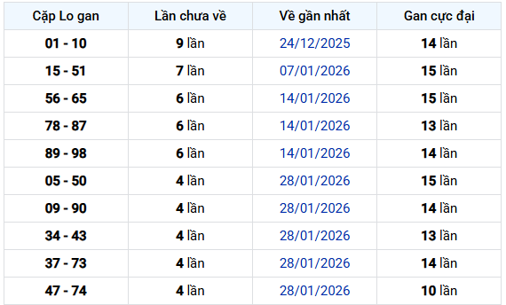 Bảng cặp lô gan hiện tại cho thấy chu kỳ gan đang ở mức trung bình nhưng đã bắt đầu xuất hiện những điểm nóng đáng chú ý — giai đoạn thường dễ hình thành nhịp quay lại bất ngờ, được nhiều người quan tâm trong các bài dự đoán xổ số Đồng Nai ngày mùng 4 tháng 3 năm 2026.
