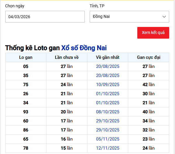 - Bảng thống kê lô gan Đồng Nai lâu chưa ra tính đến ngày 4/3/2025