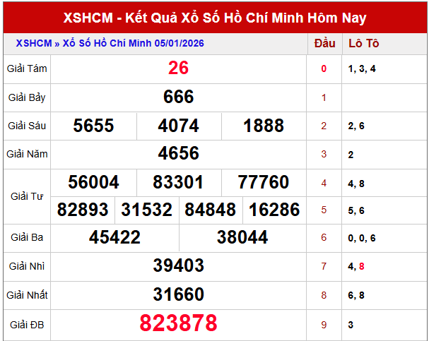 Dựa trên kết quả XSHCM gần đây cùng phân tích thống kê liên quan, danh sách các con số sáng giá đã được tổng hợp nhằm hỗ trợ dự đoán xổ số Hồ Chí Minh ngày mùng 10/1/2026 một cách hiệu quả hơn.