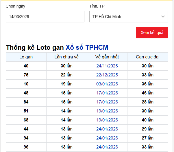 - Bảng thống kê lô gan Hồ Chí Minh lâu chưa ra tính đến ngày 14/3/2025