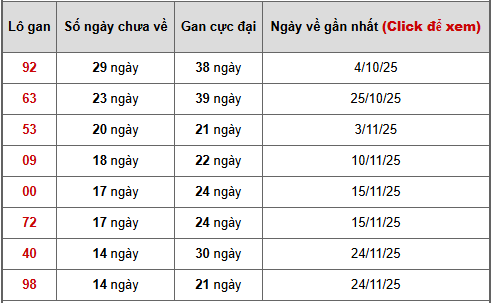 - Bảng thống kê lô gan Hồ Chí Minh lâu chưa ra tính đến ngày 17/1/2025