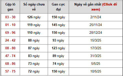03 – 30 (126 ngày) → Gan cực đại 150 ngày, hiện đã vượt 80% ngưỡng dài nhất. Đây là cặp có thời gian vắng mặt lâu nhất, đang tiến sát vùng dễ xuất hiện trở lại theo chu kỳ thống kê.