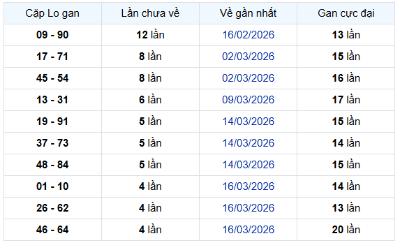 Dựa trên bảng cặp lô gan, có thể thấy nhiều cặp số đang tiến sát ngưỡng gan cực đại, báo hiệu khả năng quay đầu theo chu kỳ thống kê khi soi cầu xổ số Hồ Chí Minh ngày mùng 4 tháng 4 năm 2026.