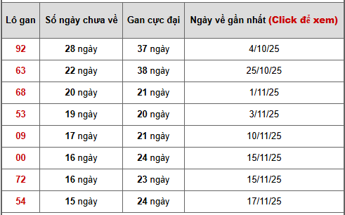 - Bảng thống kê lô gan Hồ Chí Minh lâu chưa ra tính đến ngày 12/1/2025