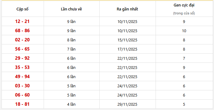 ⭐️ Cặp lô khan HCM ít về nhất: 12 - 21 (9 lần), 68 - 86 (9 lần), 02 - 20 (8 lần), 56 - 65 (7 lần), 29 - 92 (6 lần)