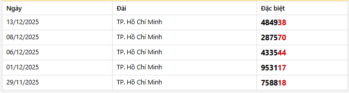 Thống kê giải đặc biệt tỉnh Hồ Chí Minh trong 5 kỳ quay gần nhất